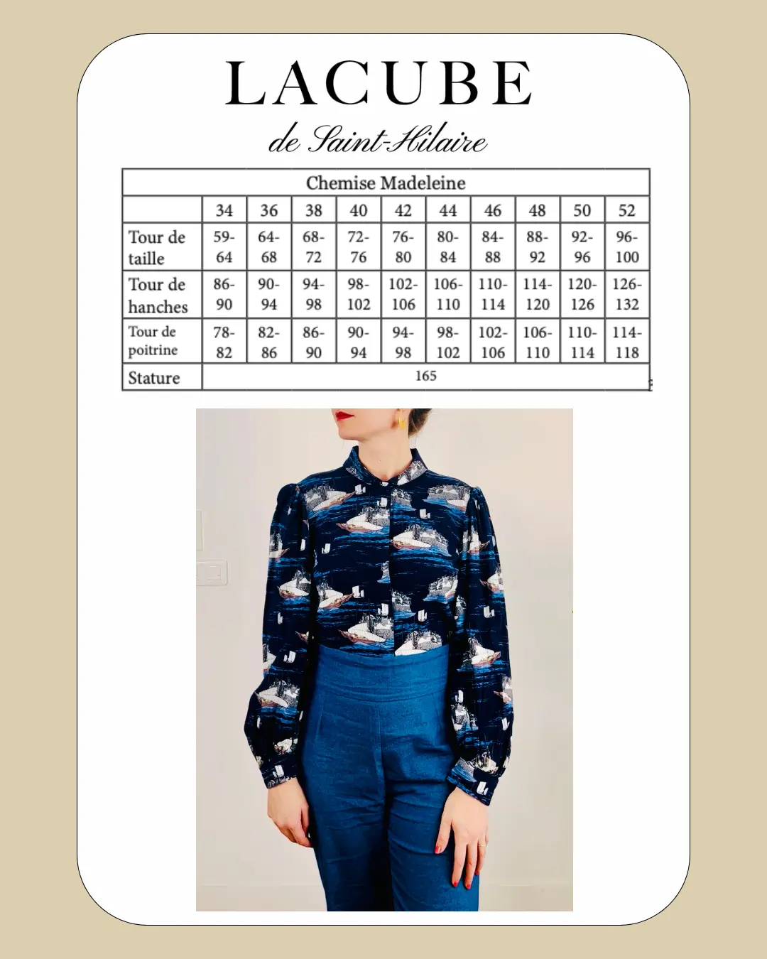 Les finitions ont été particulièrement soignées : coutures anglaises, patte de boutonnage invisible et bracelets de manches à boutons pression, digne de pièces cousues avec exigence. Grâce à ses explications détaillées et à son tutoriel vidéo gratuit, la chemise Madeleine convient parfaitement aux couturières souhaitant réaliser leur première chemise tout en progressant techniquement.